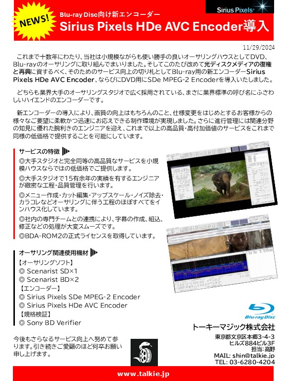 Blu-rayオーサリング強化のため、ハイエンドエンコーダーを新たに導入しました。